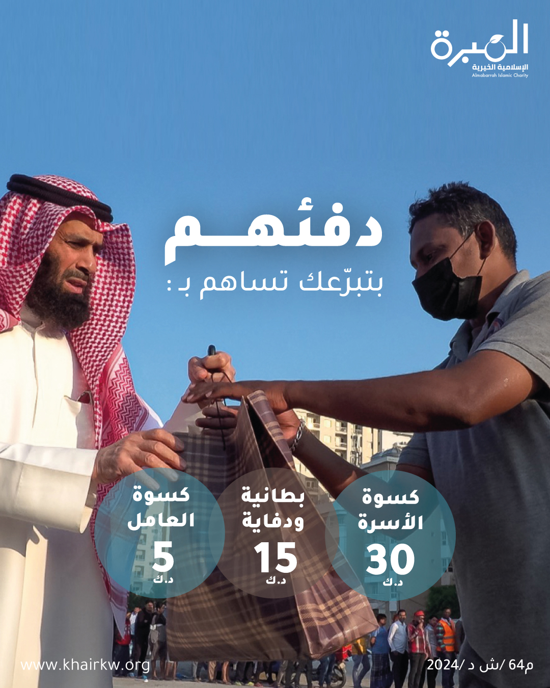 هنيئاً لمن ساهم في كسوة إخوانه من المحتاجين والأسر المتعففة وقدّم لهم يد العون والمساعدة، وأكرمهم بما أفاء الله عليه