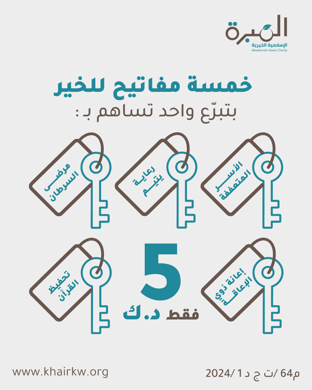 خمسة مفاتيح للخير في يديك بتبرّع واحد فقط. تساهم في خمسة مشاريع خيرية دائمة..