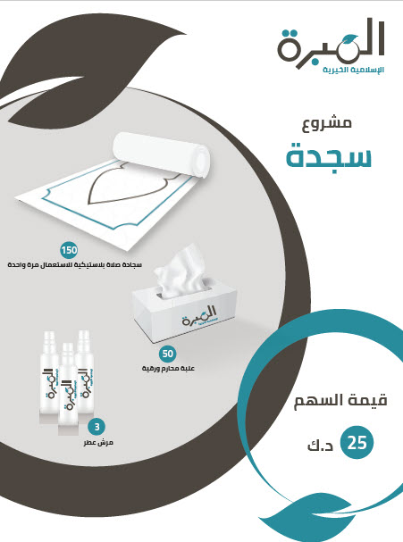 يهدف المشروع إلى توفير مياه ومحارم ورقية وروشوش معطرة وسجادات صلاة بلاستيكية للإستخدام مرة واحدة وذلك لتوزيعها على المساجد لوقاية المصلين والمساهمة في تطبيق الإشترطات الصحية التي تقوم بها بلدنا الكويت الحبيبة لمواجهة فيروس كوفيد 19 .